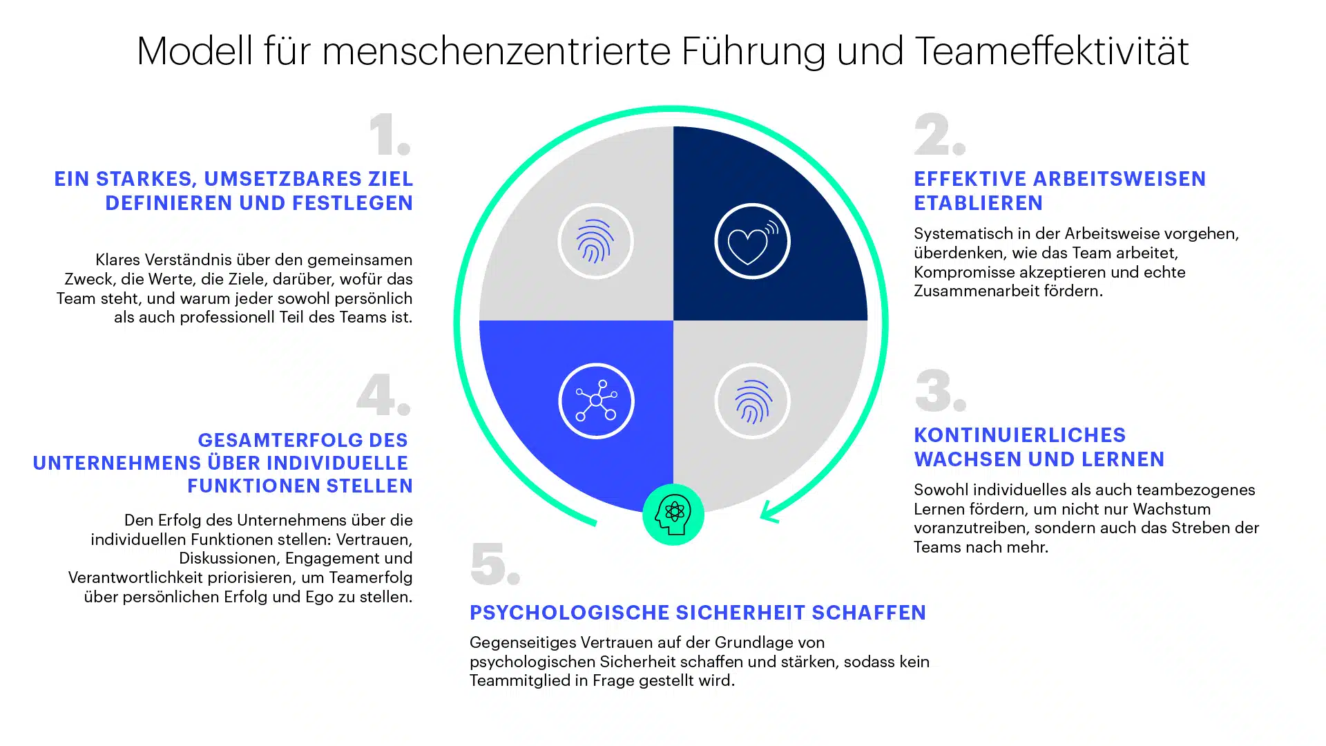 Damit Führungsteams erfolgreich sind, sollten sie einem Modell folgen, das Vertrauen, Zusammenarbeit und einen gemeinsamen Sinn für das Ziel fördert, um bedeutungsvolle Ergebnisse zu erzielen. Das „Human-Centered Leadership Team Effectiveness Model“ zeigt auf, dass die Einbeziehung aller Dimensionen des menschlichen Systems entscheidend ist, um das volle Potenzial freizusetzen und nachhaltige, wirkungsvolle Resultate zu erreichen.