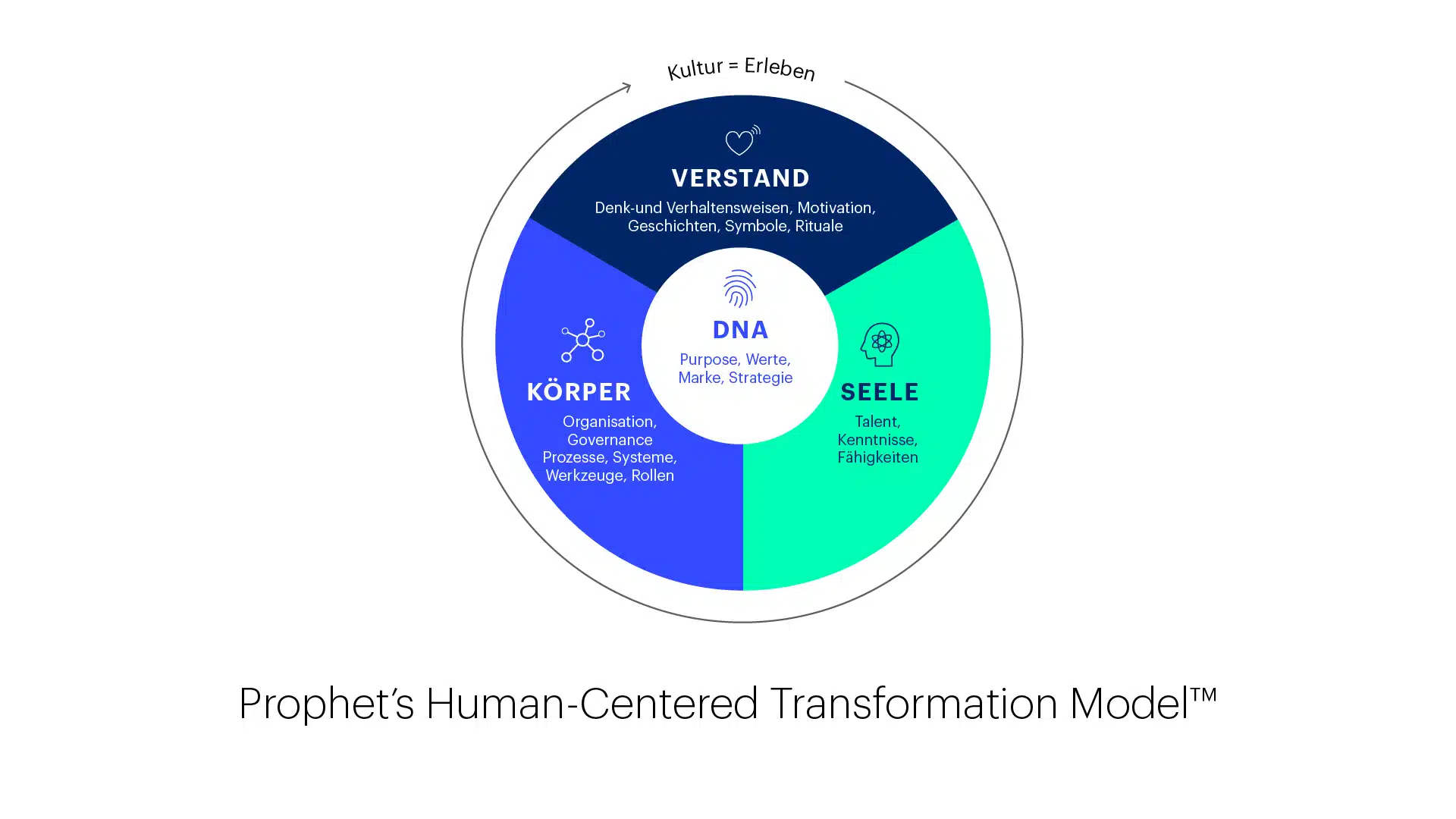 Die Grundlage dieser Arbeit ist das Human-Centered Transformation Model (HCTM) von Prophet – ein umfassender, menschenzentrierter Ansatz zur Förderung des Wachstums in der gesamten Organisation. Es basiert auf der Annahme, dass Unternehmen wie Menschen aus miteinander verbundenen Elementen bestehen: DNA, Geist, Körper und Seele.