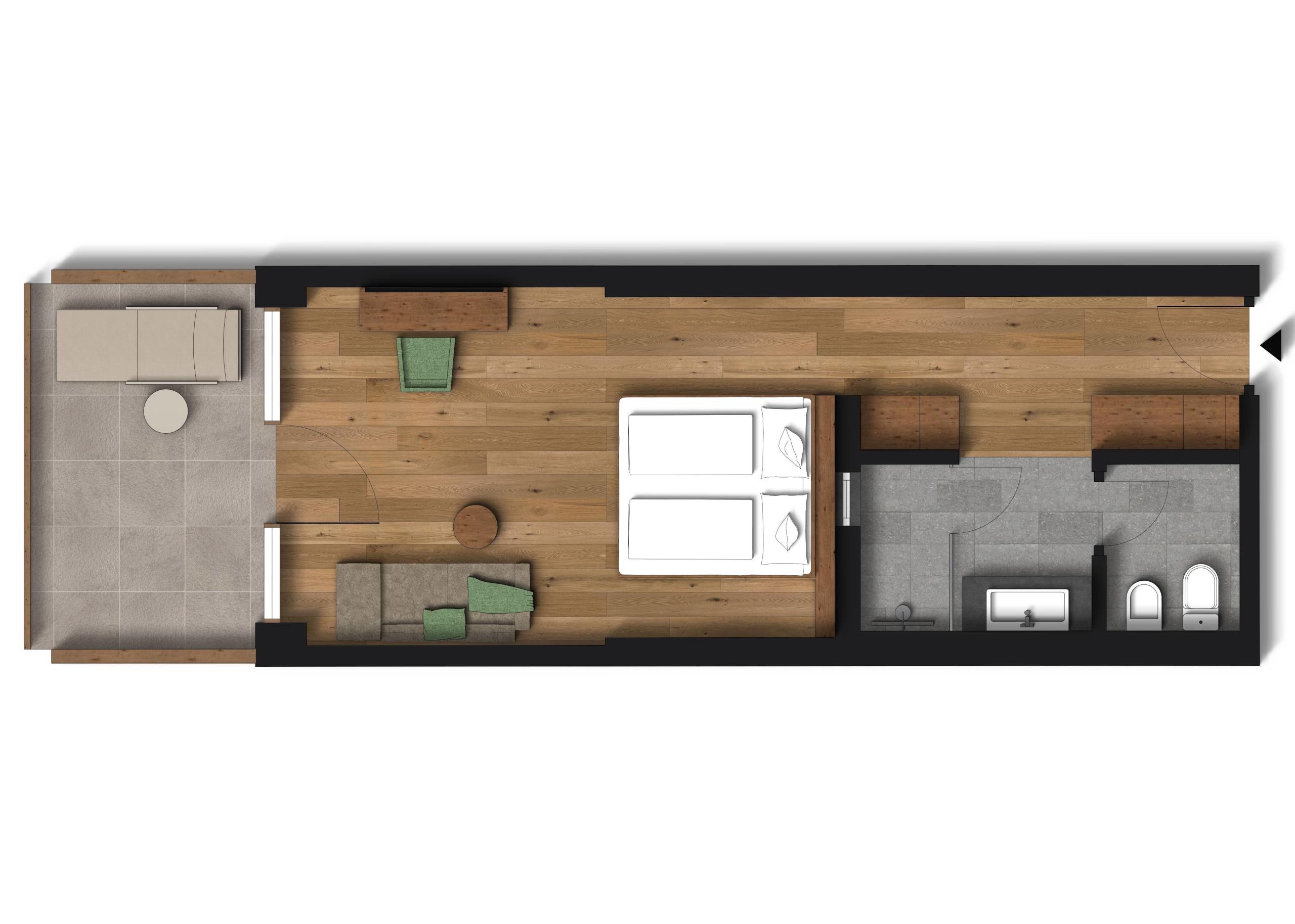 Juniorsuite, Südbalkon Dolomitenrundblick, Einrichtung Naturmaterialien, Naturholzboden. Couch, Dusche, abgetrenntes WC und Bidet,